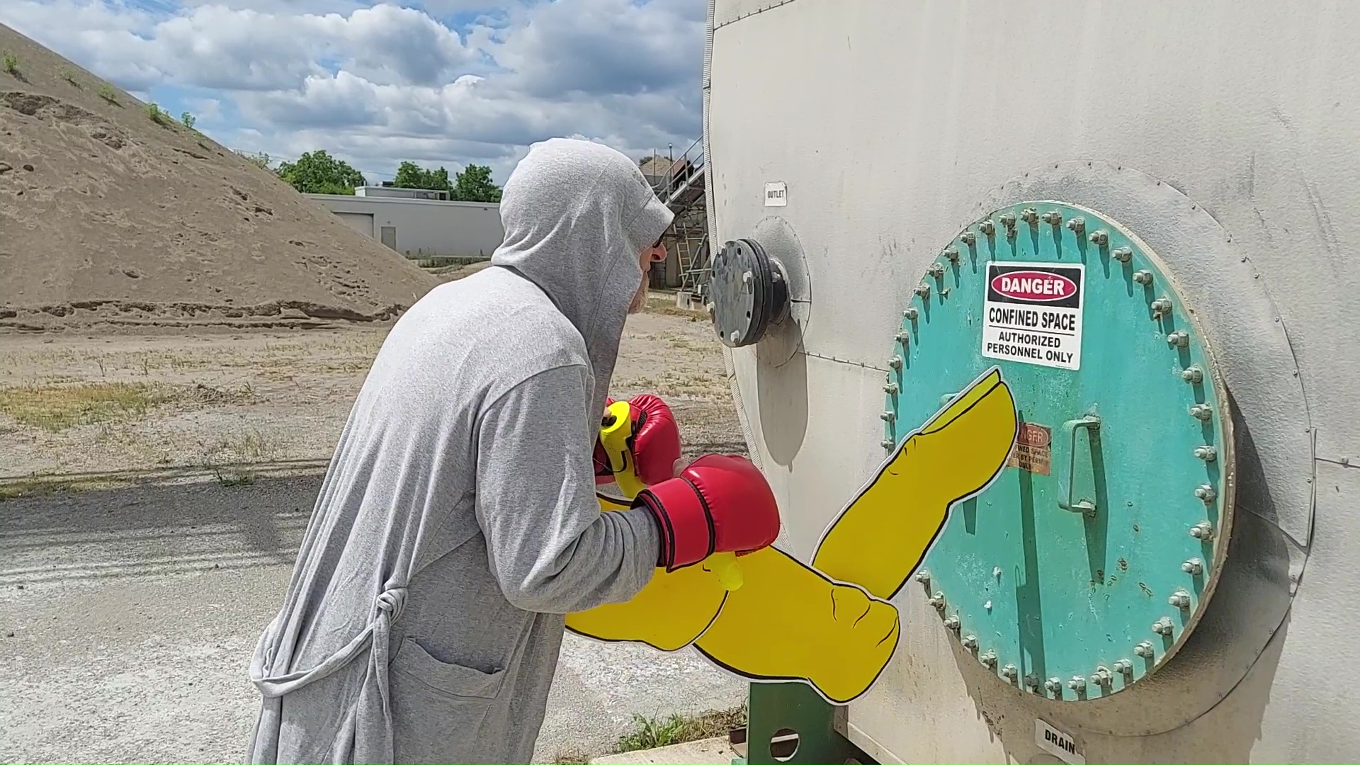 In character, I navigate high-friction public spaces while struggling to control a massive robotic appendage. My hands are stuffed inside boxing gloves that I tore the thumbs off, stripping away fine motor skills. I steer the arm with my thumbs on analog joysticks mounted in little scale-model fingers gripped inside each glove.