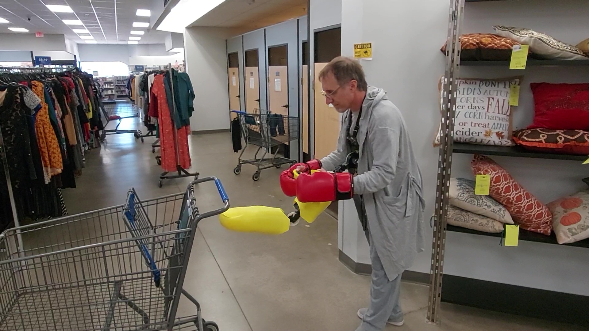 In character, I navigate high-friction public spaces while struggling to control a massive robotic appendage. My hands are stuffed inside boxing gloves that I tore the thumbs off, stripping away fine motor skills. I steer the arm with my thumbs on analog joysticks mounted in little scale-model fingers gripped inside each glove.